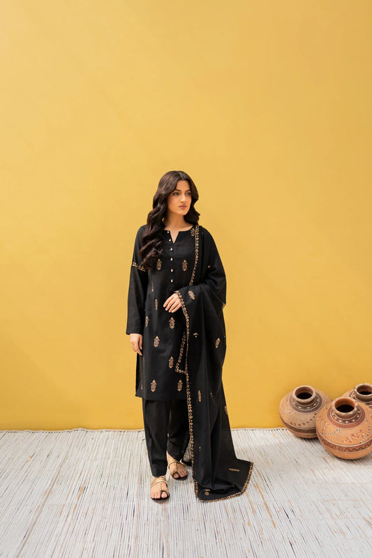 Charcoal Mist Printed Slub Khaddar Suit Set with Embroidered Trouser