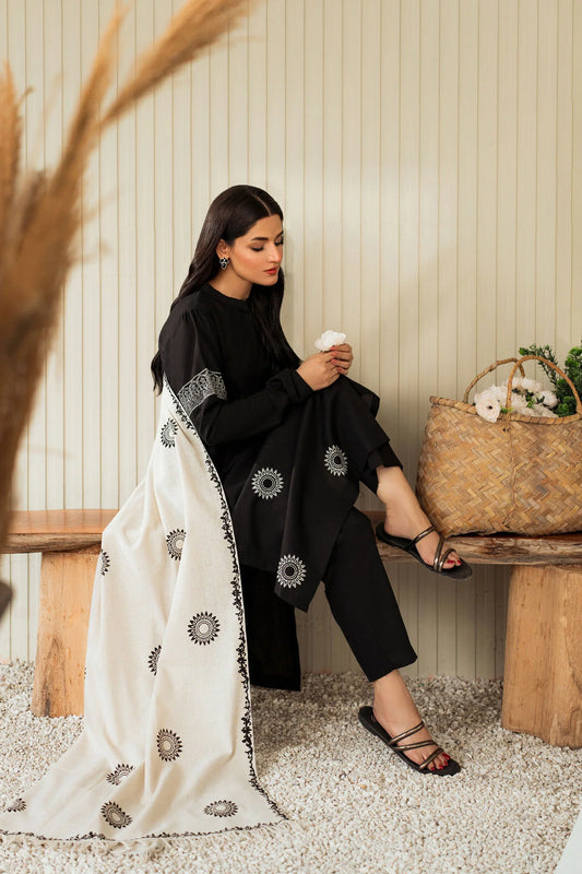 Noor Black Hand-Embroidered Cotton Suit Set with Mirror Detailing & Shawl