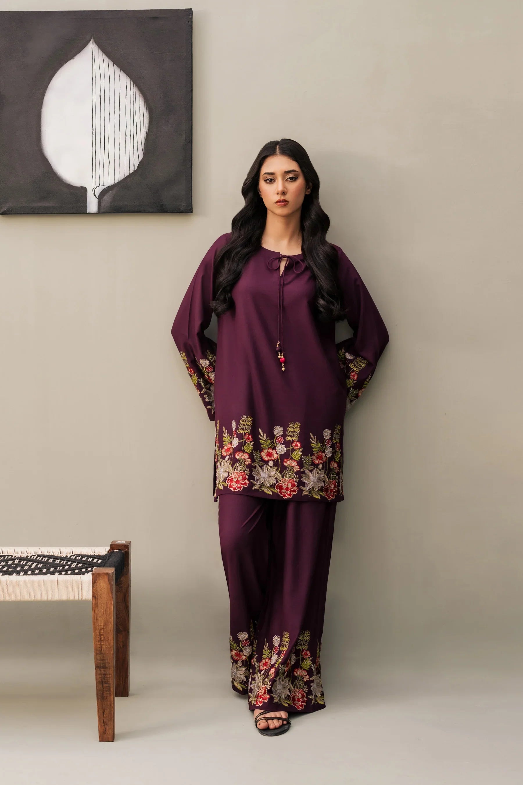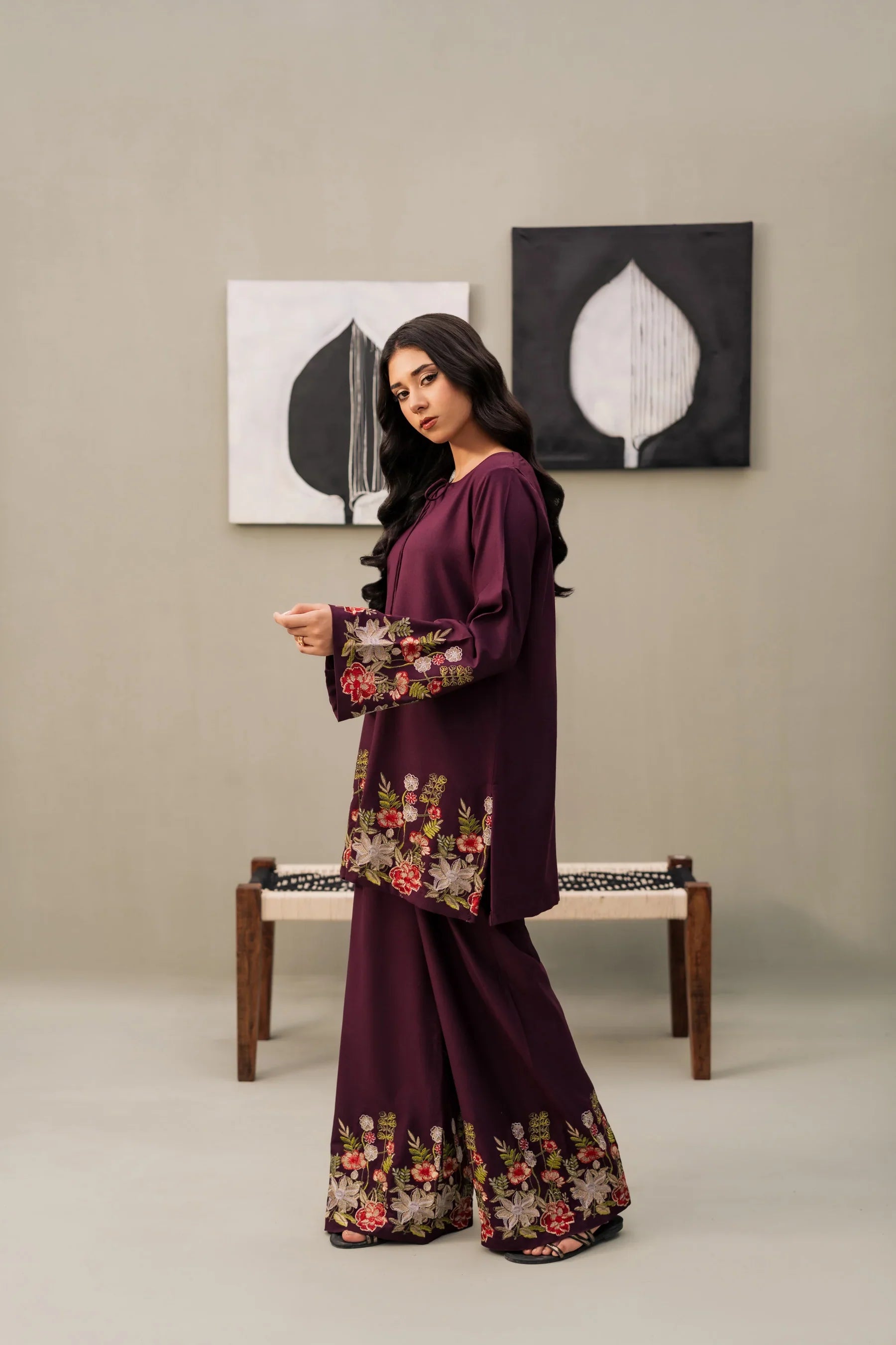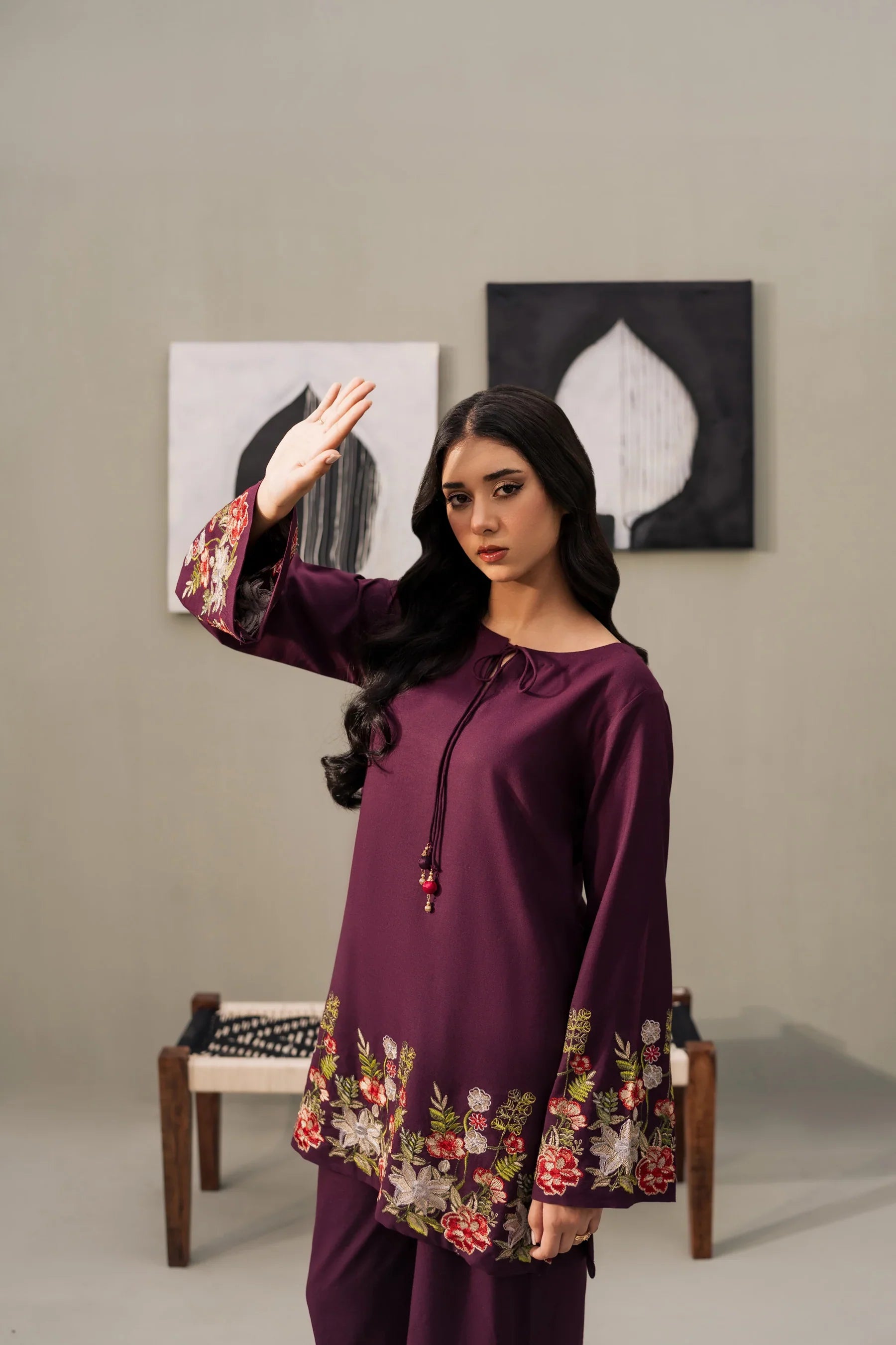 A masterpiece of contrasts — Plum Blossom brings together the richness of deep plum with the freshness of olive green in an exquisite embroidered symphony. The kurta and pants are adorned with intricate threadwork featuring floral motifs in hues of crimson, ivory, and gold, while the Shawl adds a graceful touch with delicate embroidery and subtle gold detailing.
