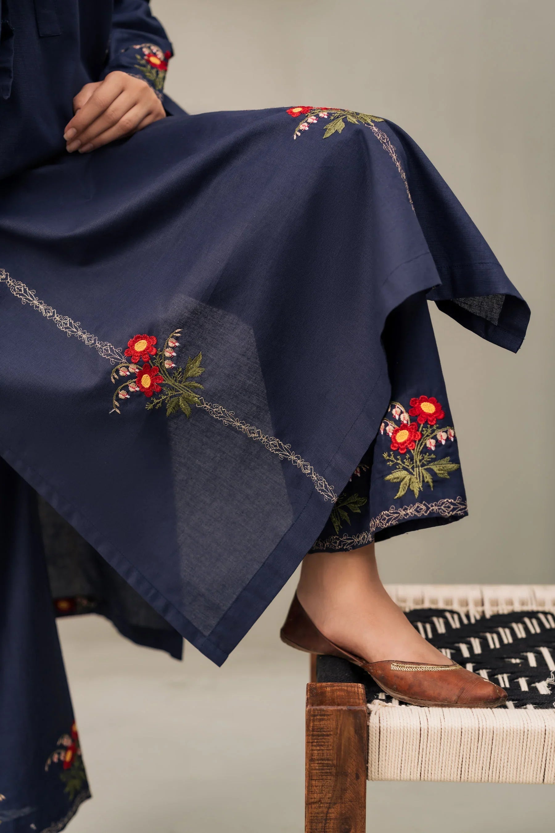 A symphony of timeless hues and delicate embroidery, the Midnight Olive ensemble captures effortless sophistication. The deep navy kurta and trousers are adorned with intricate floral motifs in rust and gold tones, balanced beautifully by an olive-green Shawl detailed with subtle thread work.
