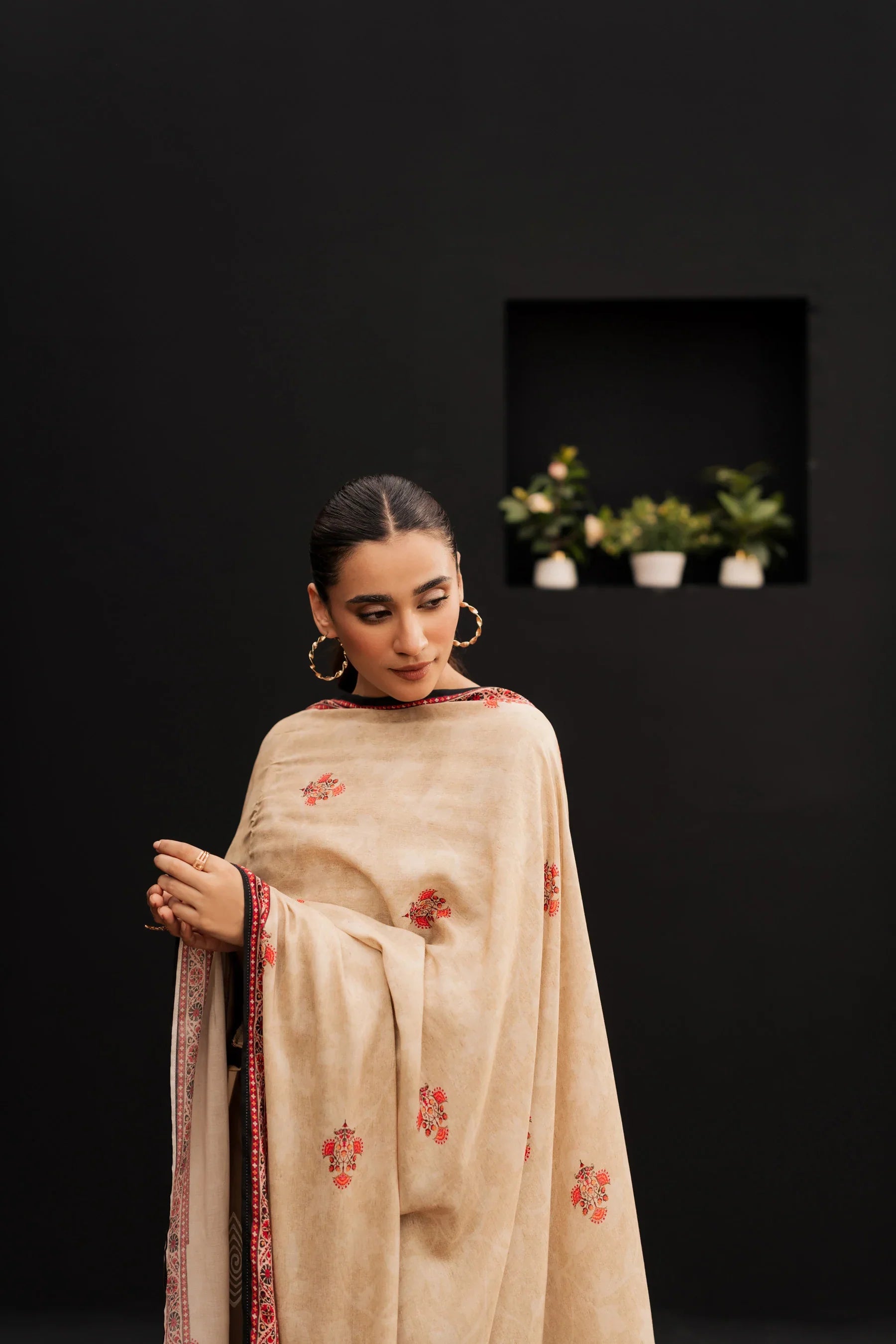 Inspired by earthy elegance, the Caramel Beige ensemble blends calm sophistication with artisanal detail. The kurta features delicate tonal embroidery and handcrafted button accents, paired with fluid matching trousers for effortless grace. Its highlight — a Kashmiri-inspired Shawl with red and ivory thread motifs — adds just the right amount of festive contrast.