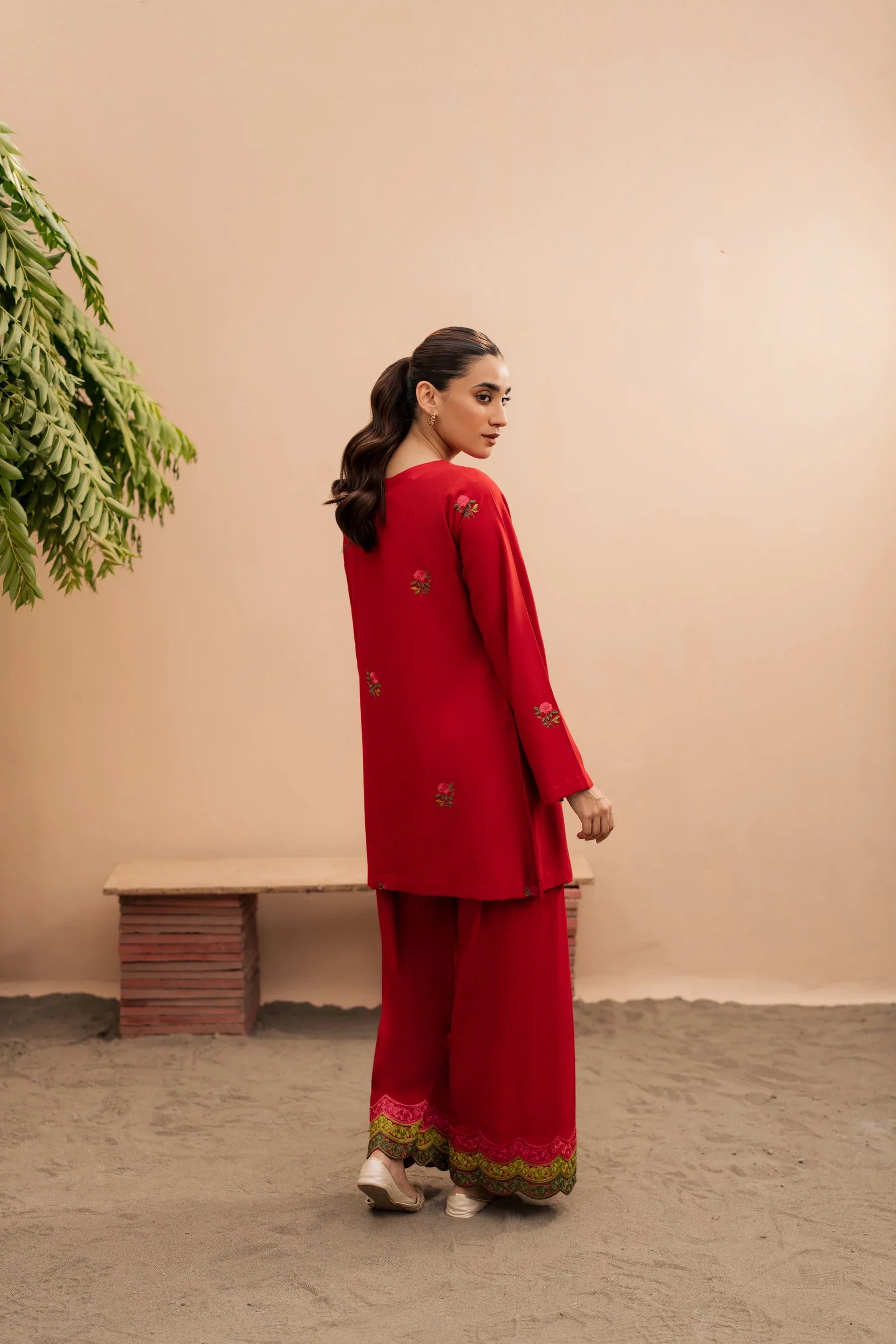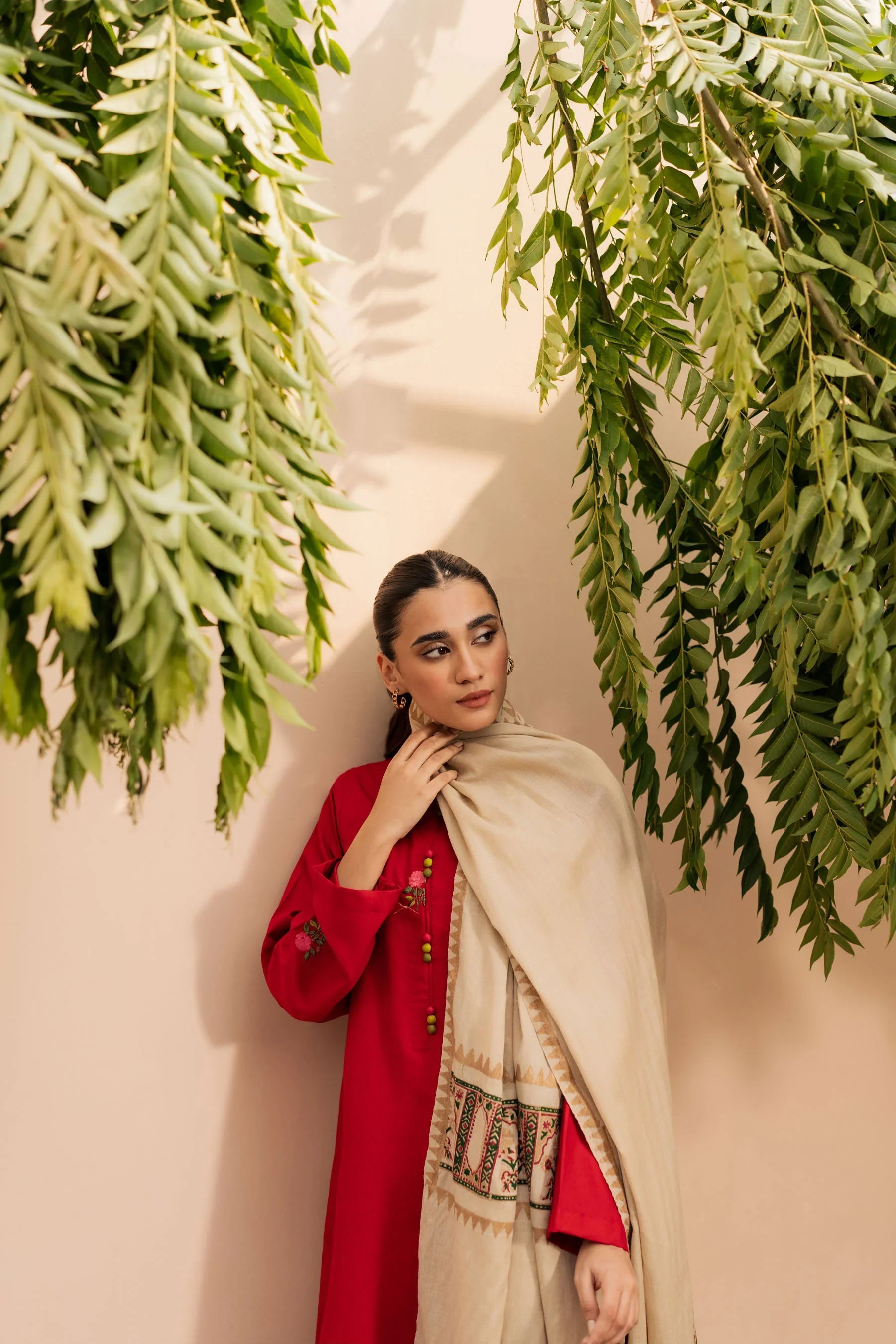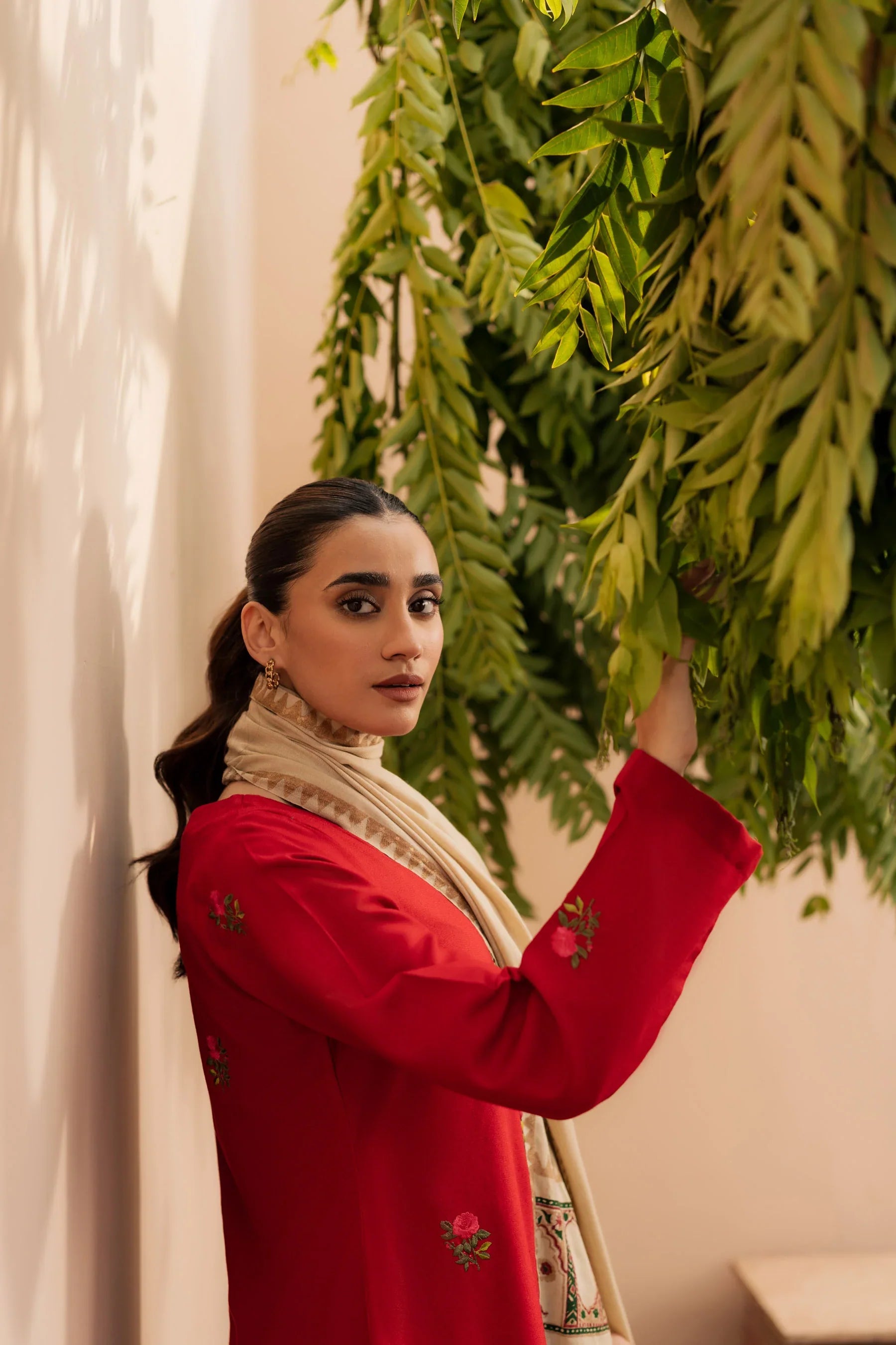 Step into the season of celebrations with Crimson Ivory — a captivating fusion of bold and serene tones. The crimson kurta is elevated with delicate floral embroidery and handcrafted buttons, while the ivory Shawl adds a touch of calm contrast through its traditional embroidered borders. Paired with wide embroidered trousers, this ensemble captures the spirit of timeless festivity and refined femininity.
