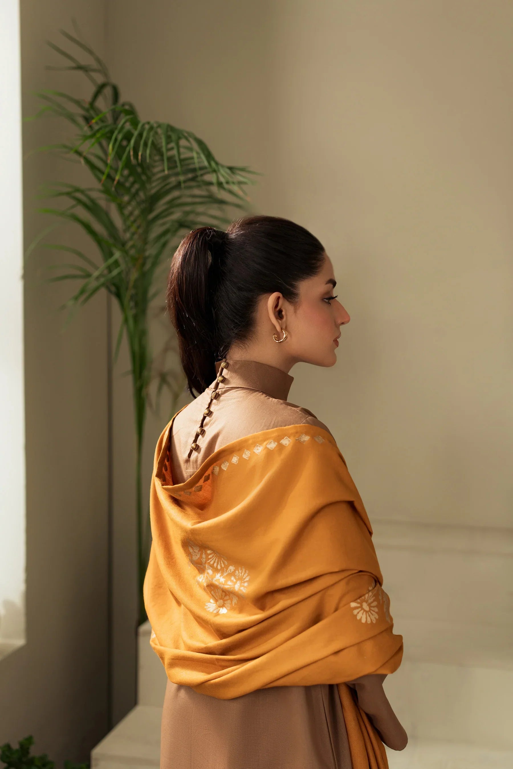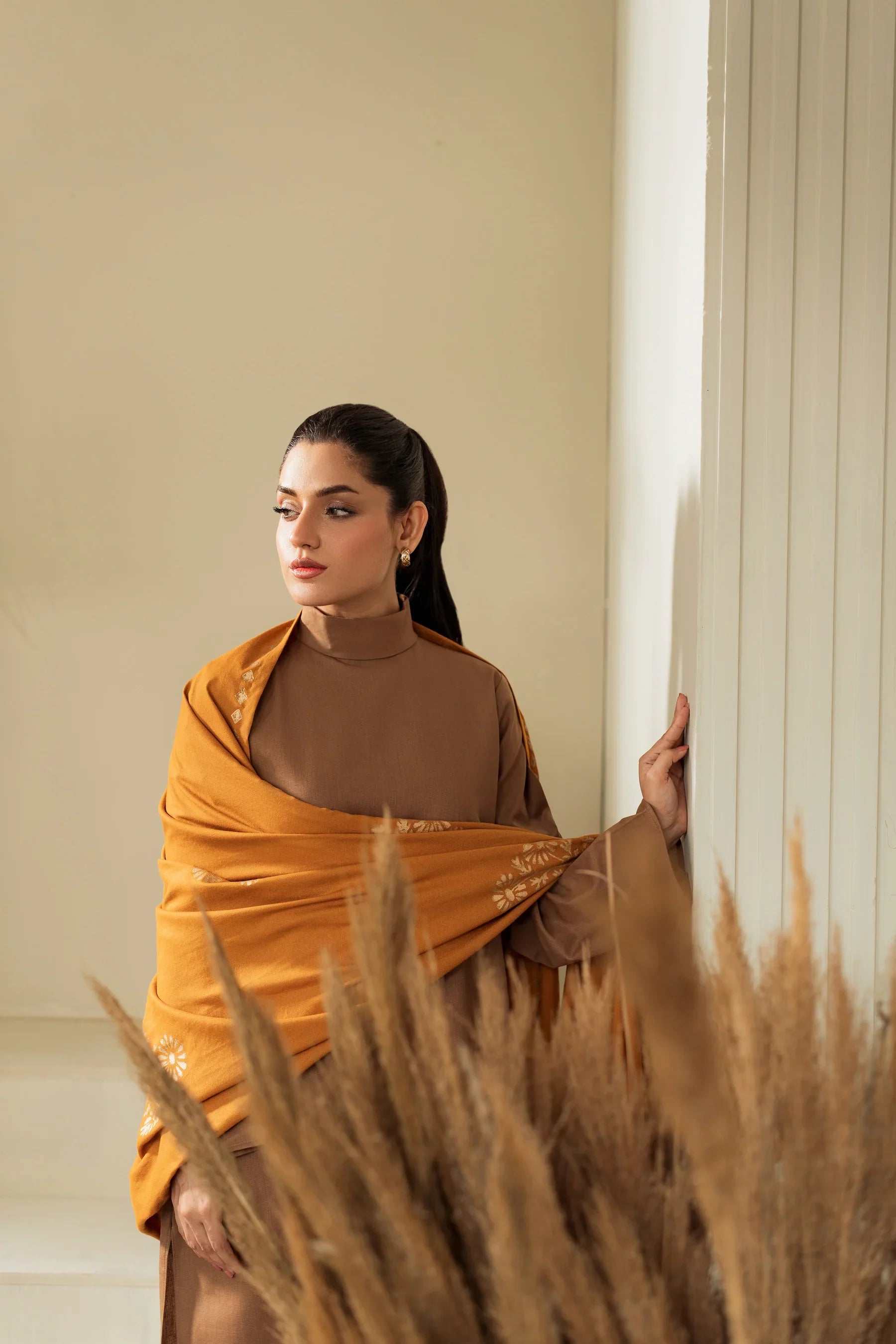 Mocha Glow Winter Kurta Set with Mustard Embroidered Shawl