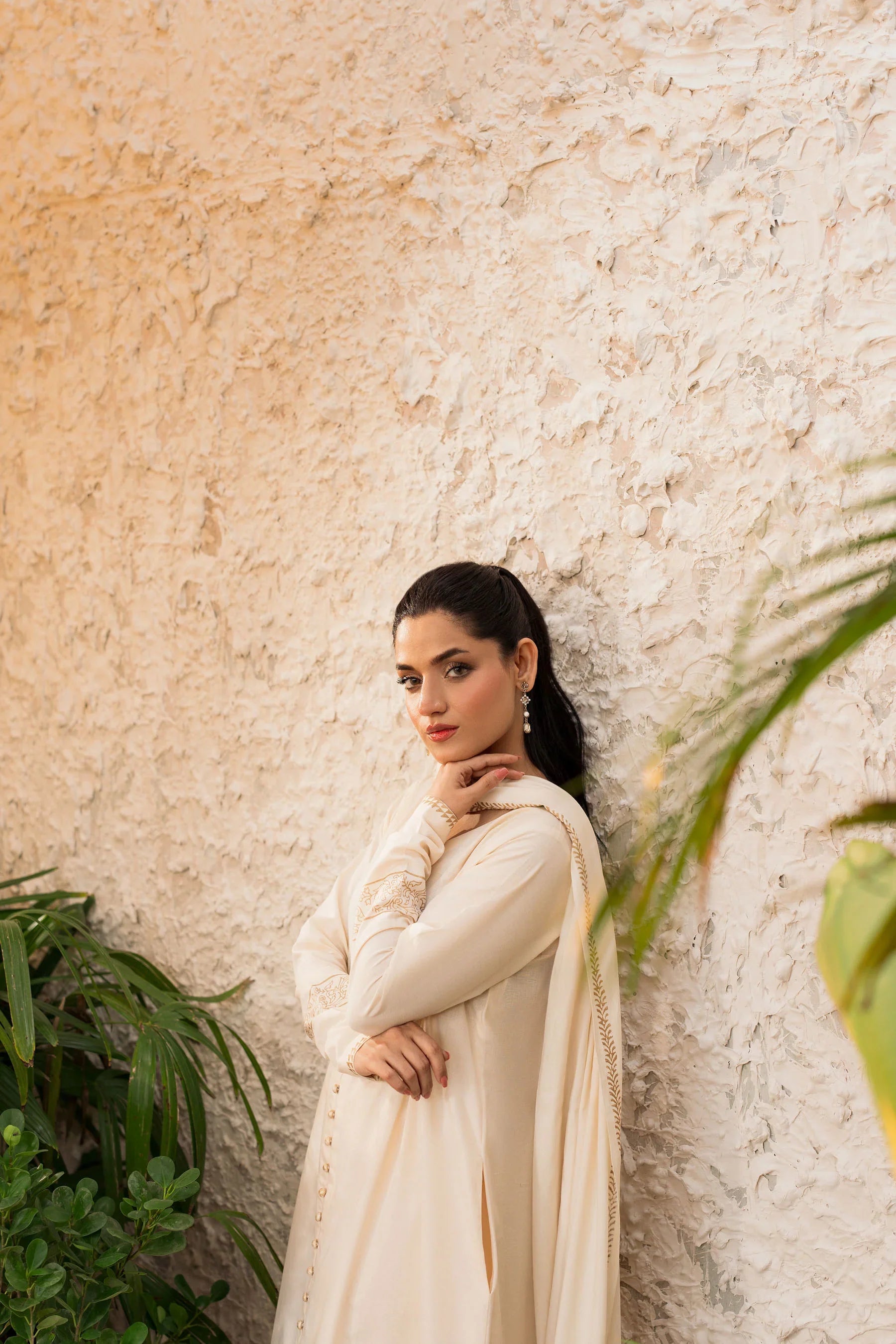 Delicate, divine, and eternally elegant — our Ivory Muse Kurta Set embodies quiet luxury. Crafted in a serene ivory hue, this ensemble features intricate tonal embroidery on the sleeves and hem, paired with a Shawl adorned with elegant motifs and scalloped borders. The straight-cut silhouette and handcrafted button detailing add to its timeless charm — perfect for festive gatherings, intimate celebrations, or serene evening soirées.