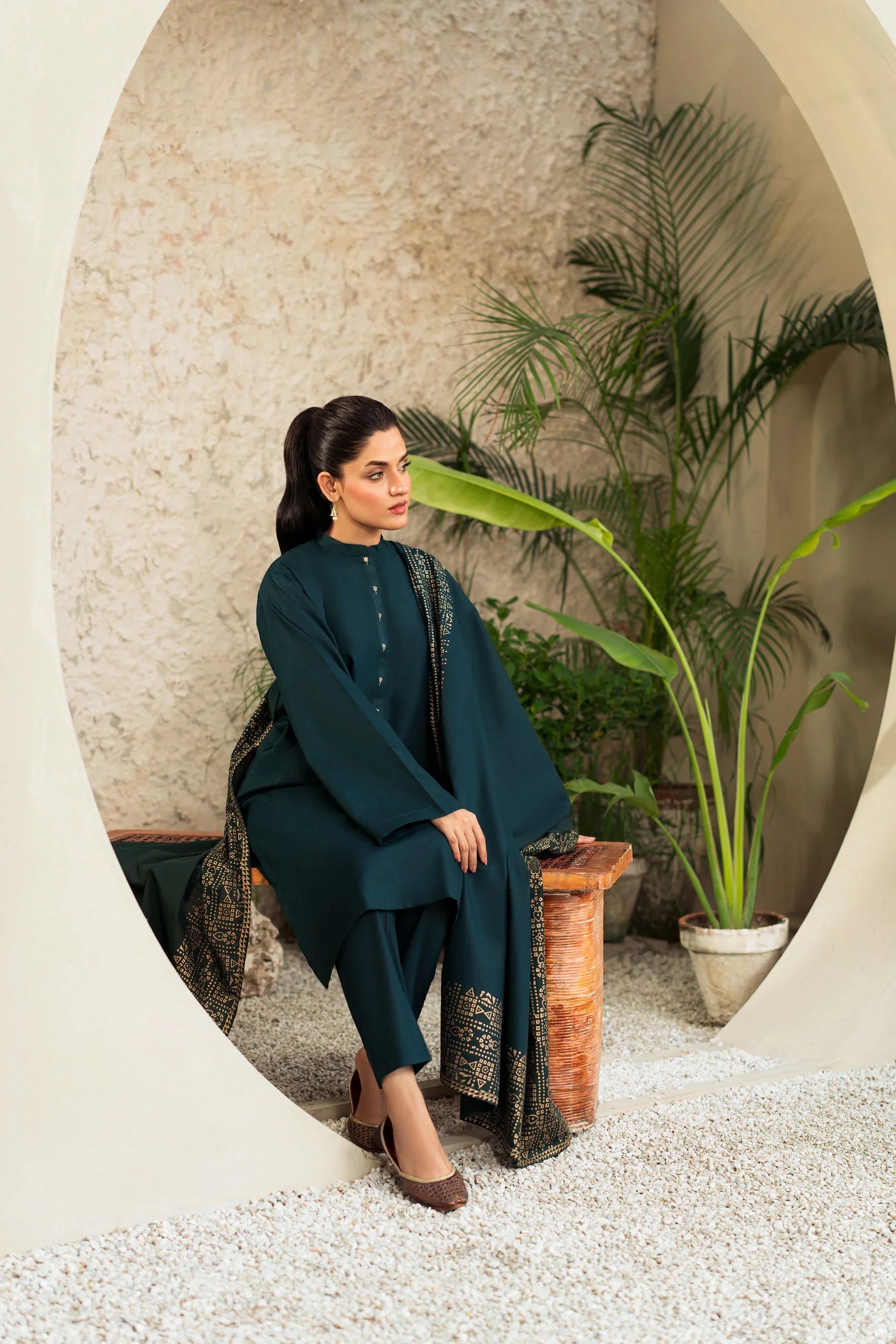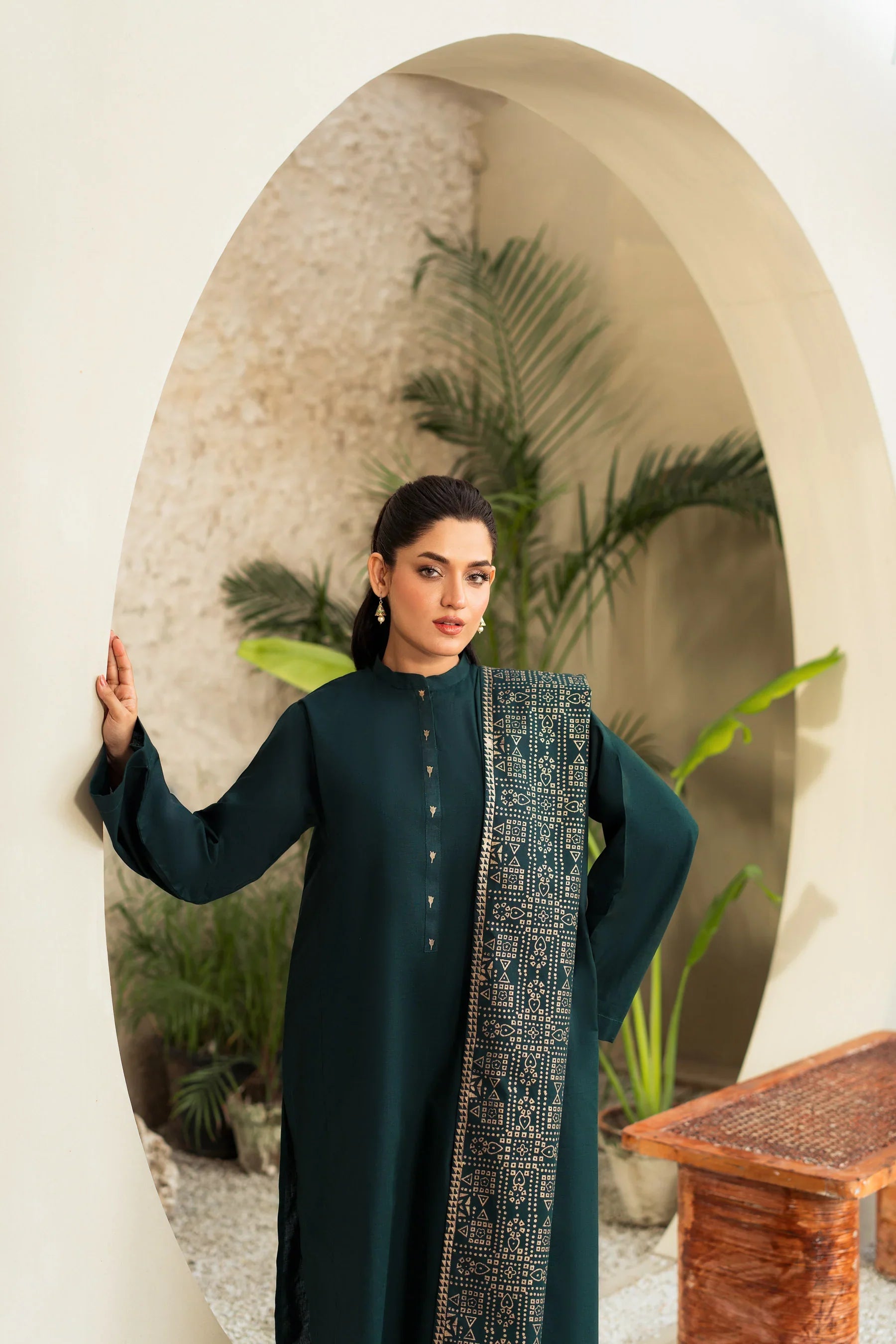Emerald Majesty Winter Kurta Set with Geometric Embroidered Shawl
