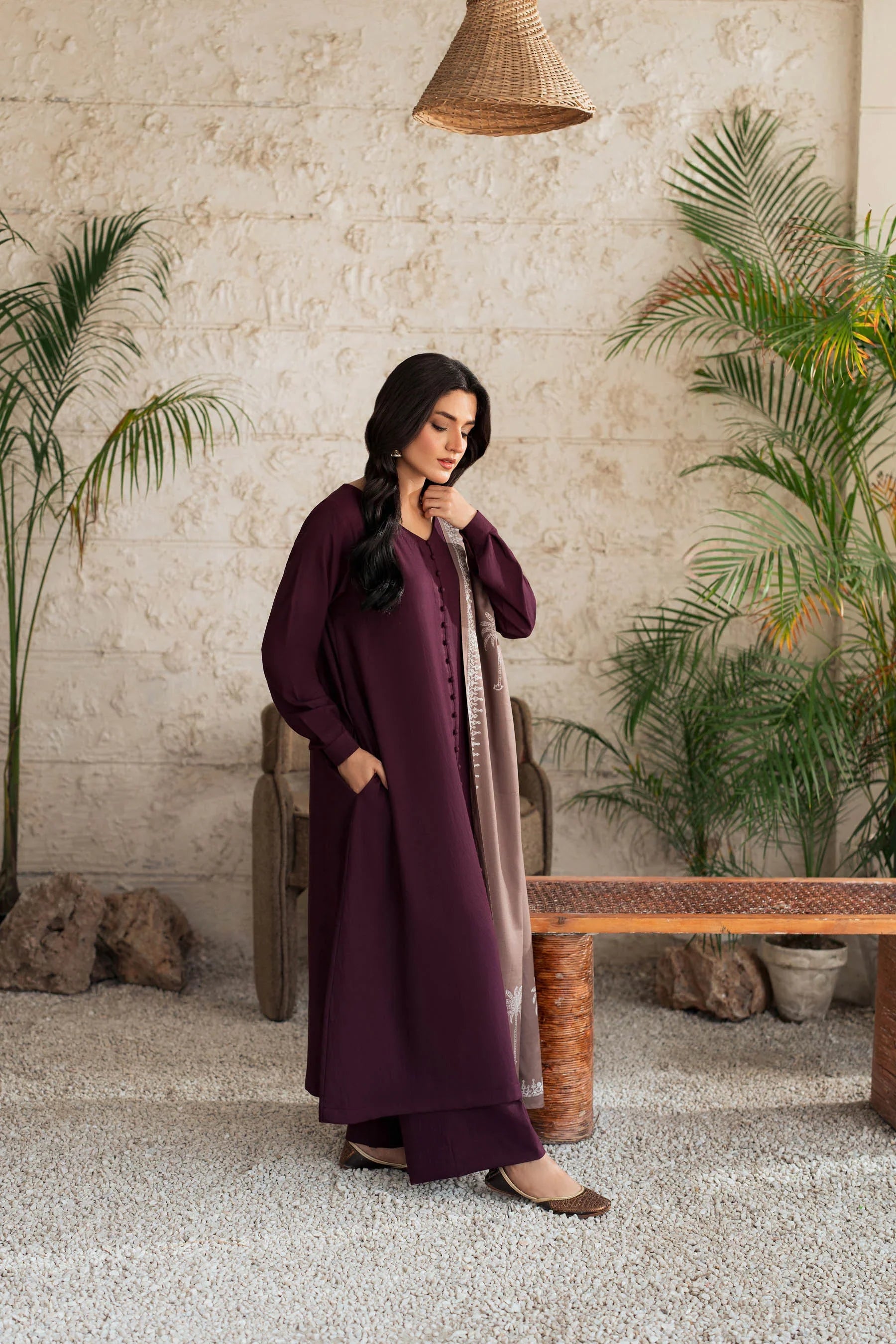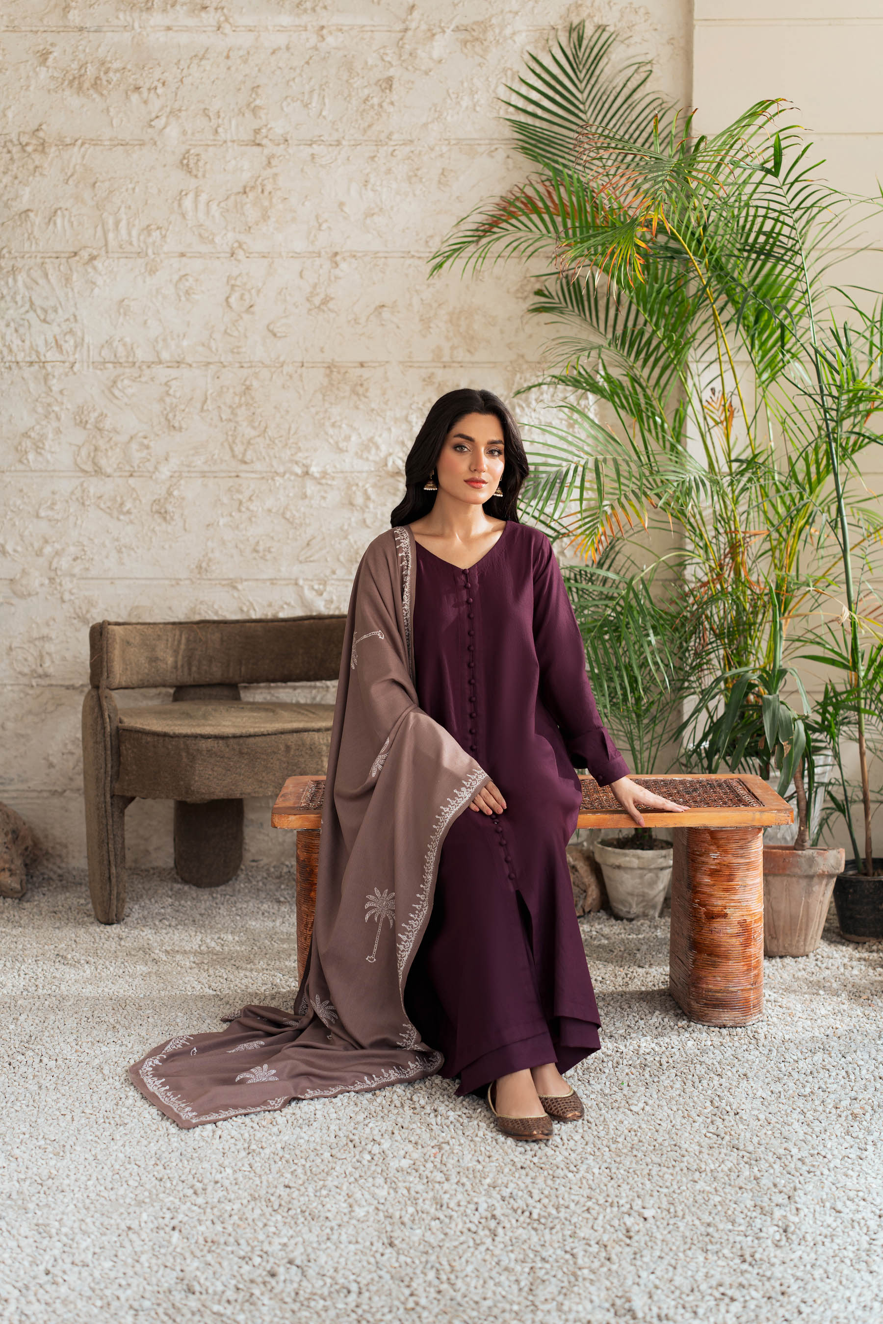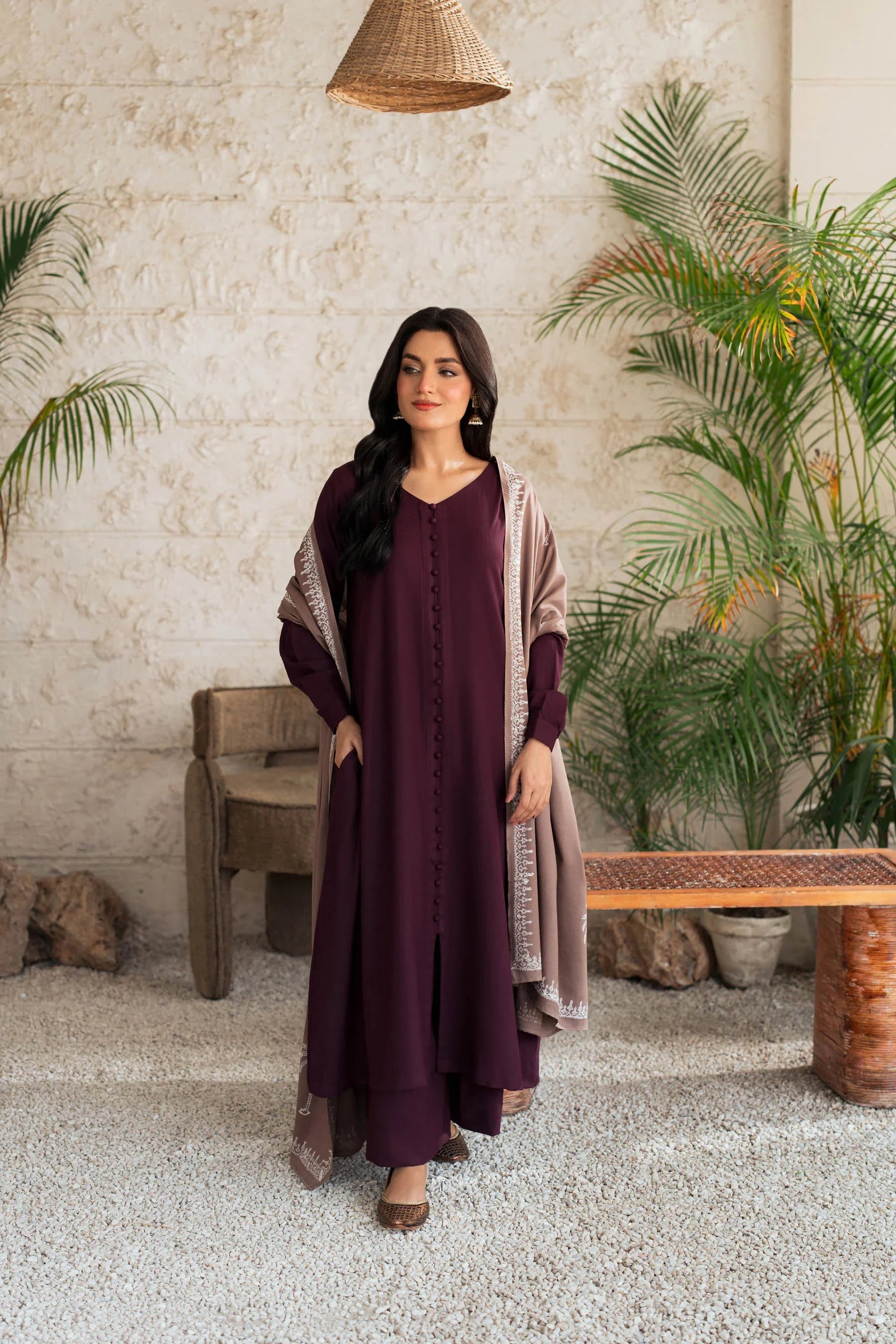 Understated luxury meets effortless grace in our Plum Serenity Kurta Set. Crafted in a deep plum hue, this elegant ensemble features fabric buttons down the front and a beautifully embroidered taupe Shawl that adds a soft contrast. Perfect for festive gatherings, winter soirées, or formal occasions, this outfit embodies refined femininity and timeless style.