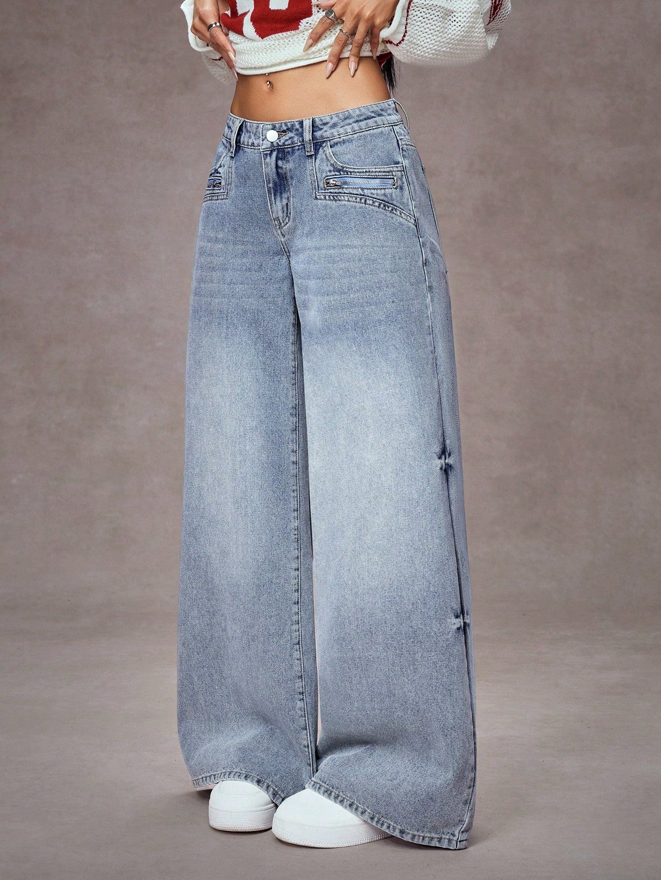 The light vintage wash adds a soft, lived-in feel, while the decorative dual zipper details near the pockets bring a unique retro edge. Perfect for pairing with crop tops, sweaters, oversized tees, or chunky sneakers for a runway-style streetwear look.